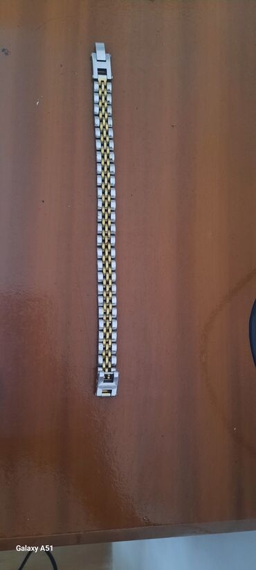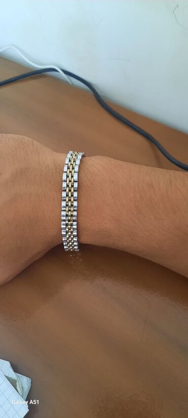 Ünvandan götürməGündəlik istifadə üçün uyğun olan ikirəngli qolbaq. Gümüşü və qızılı rənglərin birləşməsi ona müasir və zərif görünüş verir. Metal birləşmələrindən hazırlanmışdır. Hər hansı bir geyim tərzi ilə uyğun gəlir və həm kişilər, həm də qadınlar tərəfindən istifadə edilə bilər.