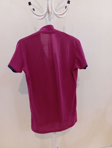 M ölçülü kişi polo köynəyi - Rəng: tünd çəhrayı/mağenta, tünd göy detal və haşiyələrlə - Model: qısaqoll, yaxası düyməli polo tipli açılış - Material: nazik və yüngül toxuma (yay üçün uyğun) - Diz...