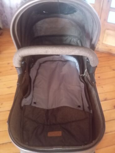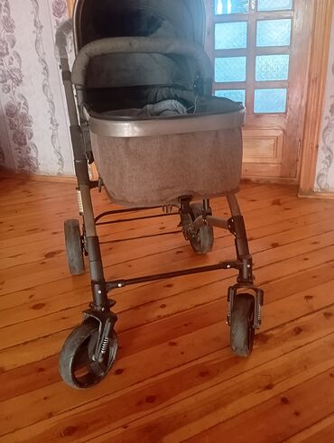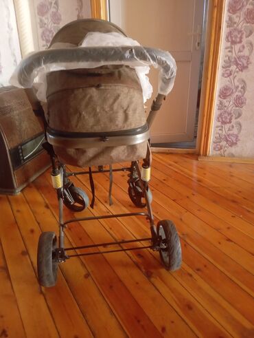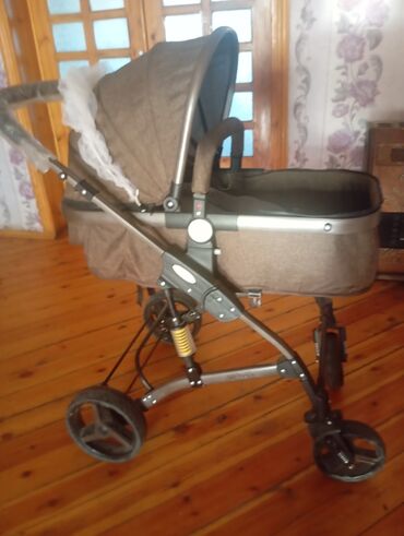 Uşaq arabası – 90 manat Xüsusiyyətlər: - Beşik tipli oturacaq/layan bölmə - Geniş, tənzimlənən günlüyə sahib örtük - Möhkəm alüminium şassi, ikiqat amortizasiya hissələri - 4 təkər: ön təkərlər çe...55 AZN