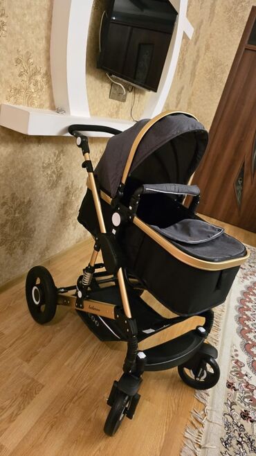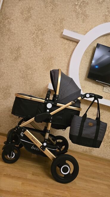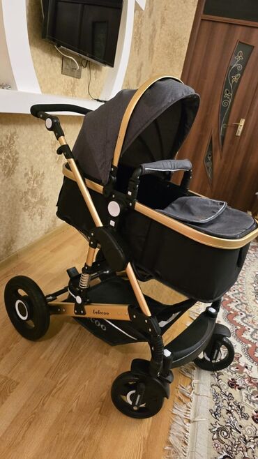 Qızılı çərçivəyə malik qara rəngli Belecoo uşaq arabası. Bu model beşik və oturacaq funksiyalarını birləşdirən çevrilə bilən dizaynı ilə seçilir. Təkərləri amortizasiya sistemi ilə təchiz olunmuşdur. Uşaq arabasının yuxarı hissəsi boz rəngdədir və qızılı haşiyə ilə tamamlanmışdır. Uşaq arabasının tutacağında əlavə çanta asmaq üçün yer mövcuddur. Bu araba həm rahatlığı, həm də funksionallığı ilə valideynlər üçün praktik seçimdir.