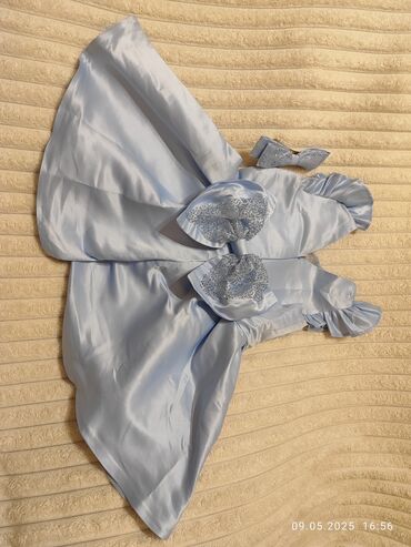 Uşaq/gecəlik ziyafət paltarı – açıq mavi rəngdə. 1defe de geyinilmeyib,cox gozel - Model: yuxarı hissəsi krujeva (naxışlı) parçadan, aşağı hissəsi çoxqatlı şifon/orqanza ətək - Üst hissədə daş və ...
