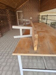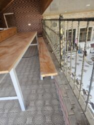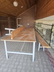 - Stol: metal karkas üzərində qalın taxta üstlük, uzunlamasına mərkəzi arakəsmə (servis/bölücü panel) ilə. Açıq məkanlarda (veranda, terras, bağ evi, çardaq) istifadə üçün uyğundur.