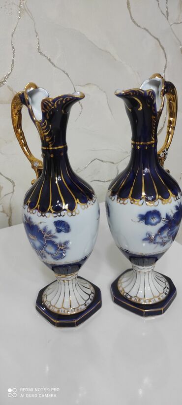 Satılır: Antik dekorativ porcelen vazalar (cüt) ✔️ Hündürlüyü: 18 sm ✔️ Məhdud sayda istehsal – №16 (nömrələnmiş) ✔️ Əl işi, klassik dizayn ✔️ Tünd göy, qızılı və çiçək naxışlı porselen ✔️ Vintage ...