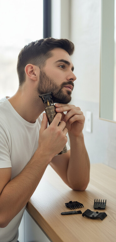 Vintage Professional T-Blade Trimmer – saç, saqqal və kontur üçün Xüsusiyyətlər: - T-formalı kəsici başlıq: sıfıra yaxın kontur, fade və dizayn işləri üçün uyğun. - Metal gövdə: rellef naxışlı kor...