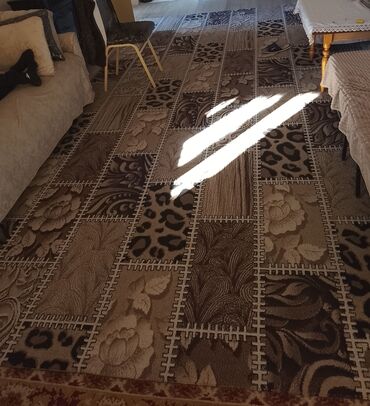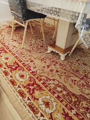 Material: şəkillərdəki toxunuş sıx, yumşaq xovlu sintetik/qarışıq tipli xalça toxumasına bənzəyir, adi ev istifadəsi üçün praktikdir.