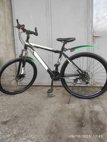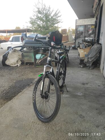 Dağ/şosse üçün universal velosiped - Çərçivə: yüngül alaşımlı, qara rəng üzərində yaşıl detallarla - Təkərlər: 29" dişli MTB şinləri, yüksək tutuşlu protektor - Amortizasiya: ön amortizatorlu çəng...
