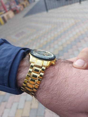 - Korpus və qolbaq: parlaq qızılı rəngdə metal, bərk halqalı braslet, qatlanan kilid.