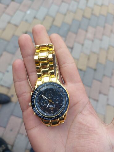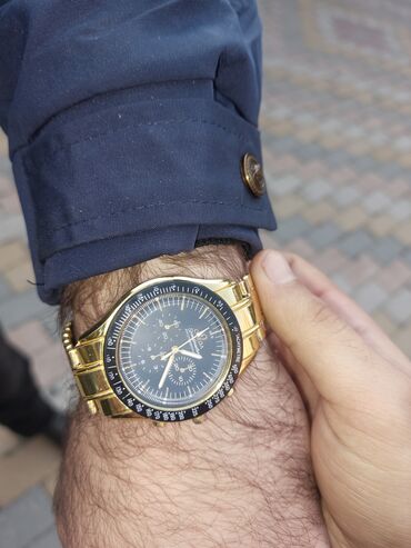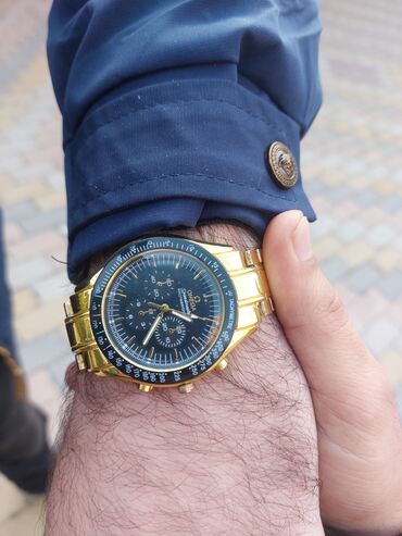 Şıq görünüş və funksionallığı birləşdirən, xronoqraf və tachymeter xüsusiyyətli qızılı rəngli kişi saatı.