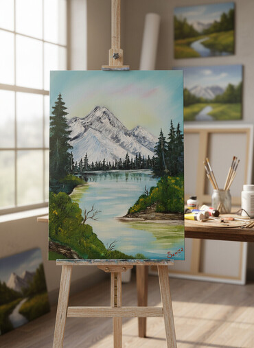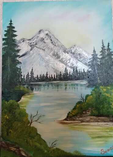 - Mövzu: qarlı zirvələr, iynəyarpaq meşəsi və sakit göl mənzərəsi