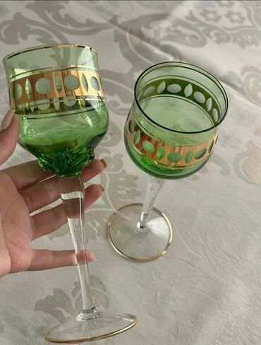 Yaşıl şərab qədəhləri dəsti – 2 fərqli üslub, hərəsindən 6 ədəd. - Dəst 1: Zümrüd-yaşıl bəzəkli kristal qədəhlər. Şəffaf kasanın ortasında mat-yaşıl zolaq, əllə çəkilmiş çiçək naxışı və qızılı haş...