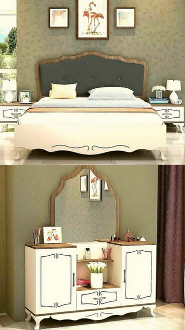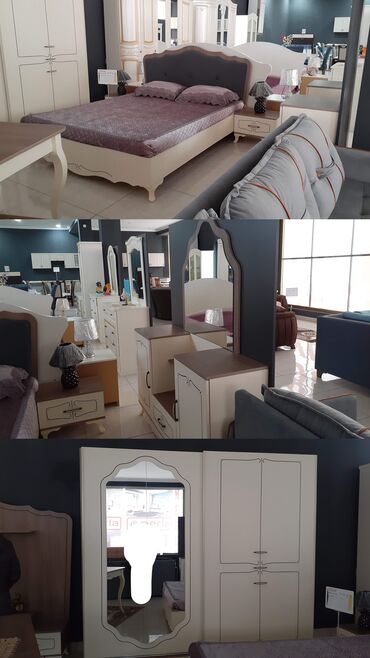 Yataq otağı dəsti – birbaşa istehsaldan, rəng seçimi sərbəstdir. Komplektə daxildir: - 5 qapılı şkaf (güzgülü qapılar, qızılı dekor panellər, asılqan və rəf bölmələri) - Tumba - Tuvalet masası güzg...