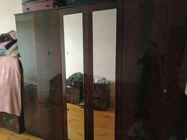 - 5 qapılı geniş qarderob: iki tam boy güzgülü orta qapı, yanlarda asılqan və rəf bölmələri, tünd qəhvəyi (palıd naxışlı) parlaq səth.