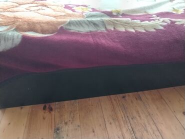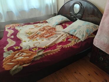 - İki nəfərlik çarpayı: hündür dekorativ başlıq, ortasında dairəvi güzgü elementli oyma naxış; klassik tünd qəhvəyi dizayn.