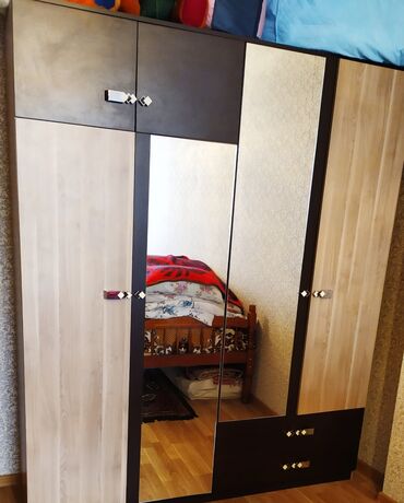 - Geniş 4 qapılı qarderob: iki böyük güzgülü orta qapı, yuxarı dolab bölmələri, aşağıda çekmece/blok, yanlarda asılqan və rəf üçün bölmələr. İki rəngli (tünd qəhvəyi və açıq ağac teksturası) dizayn, dekorativ metal tutacaqlar.