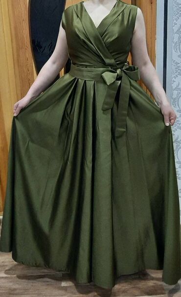 Yasəmən-yaşıl rəngdə, zərif axıcı fakturalı ziyafət paltarı. - İnce, tənzimlənə bilən spagetti askılar - Büst hissəsində dərin V kəsim və büzgülü dizayn - Dekolte xəttində iri şüşə/kristal daş a...