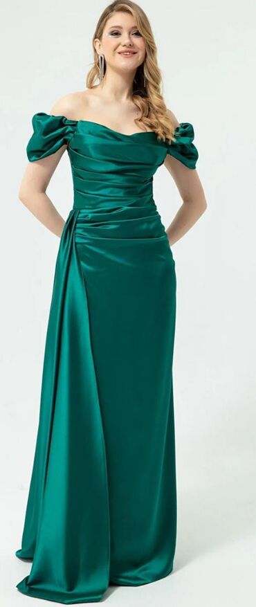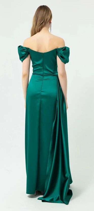 Tünd yaşıl rəngdə, zərif atlas parçada uzun ziyafət/libas. Xüsusiyyətlər: - Model: çiyinüstü (off-shoulder) kəsim, nazik adjustable askılarla - Üst hissə: qat-qat büzgülü korsevari forma, beli vur...