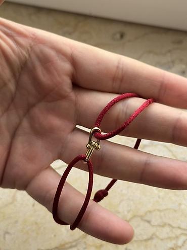 Qırmızı ipdən hörülmüş qolbaq - Material: Möhkəm qırmızı ip, kvadrat formalı qırmızı muncuqlar və qızılı rəngdə dekorativ ara muncuqlar - Dizayn: Makrame üslubunda hörgü; qırmızı və qızılı tonları...