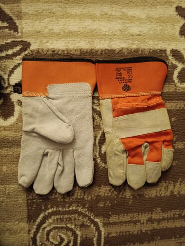 - Narıncı/parça kombinasiyalı dəri ovuclu əlcəklər – gücləndirilmiş ovuc, geniş manjet, CE işarələnməsi və piktogramlar. Ölçü: 10 (etiketdə “Size 10 / 4121” oxunur).