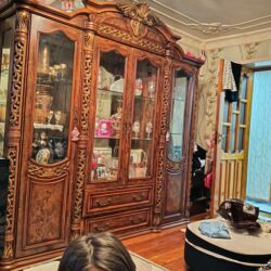 Klassik üslubda iri vitrinali bufet - Material: təbii ağacdan (oyma dekorlu), rəngi qoz tonlarında - Üst hissə: üç şüşəli vitrin bölməsi, hər bölmədə şüşə rəflər; yan tərəflərdə də şüşəli vitrində...
