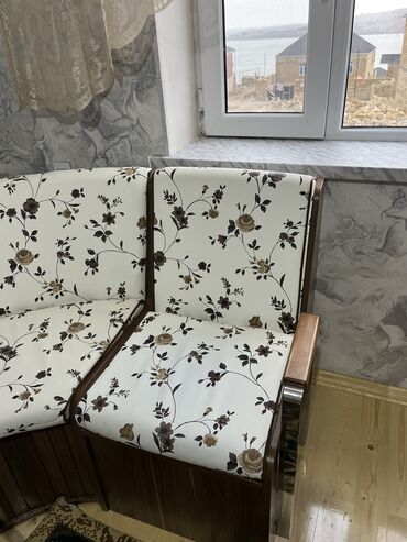 - Material: Tünd qoz rəngli laminat/kombinə edilmiş taxta konstruksiya, metal möhkəmləndirmələr; oturacaq və arxalıqlar krem rəngli, qəhvəyi tonlarda çiçək naxışlı yumşaq parçayla çəkilib