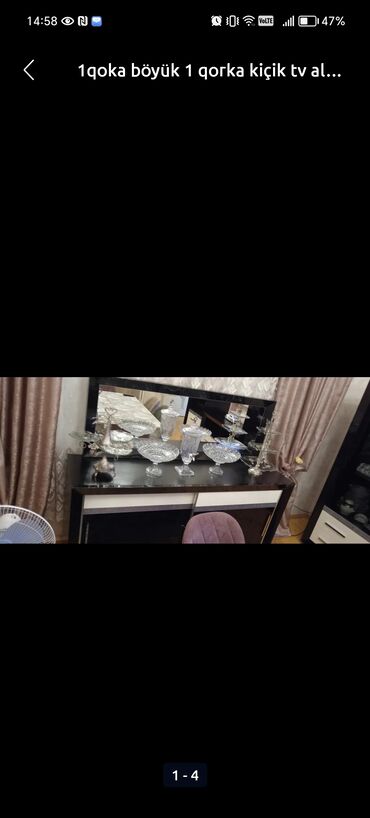 Klassik üslubda qonaq otağı dəsti Tərkibi: - Konsol güzgü ilə: 4 qapılı komod, üstündə iri dekorativ güzgü kompozisiyası. Üst masa genişdir, kristal və dekor əşyaları üçün uyğundur. - 2 ədəd vitri...