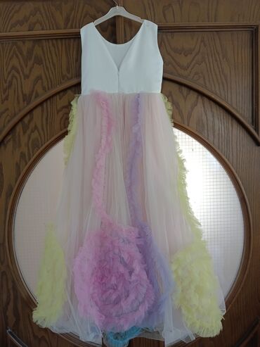 Rəngarəng tül ətəyi olan, unicorn temalı uşaq paltarı. Üst hissəsi ağ rəngdədir və üzərində qızılı rəngli buynuzlar, rəngli güllər və kirpiklər var. Çiyinləri çəhrayı tül ilə bəzədilib. Ziyafətlər ...