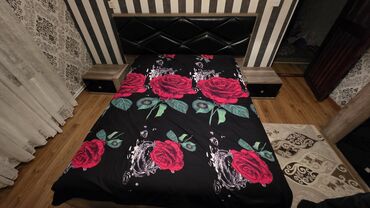 - İki nəfərlik çarpayı: yumşaq, quiltli dəri başlıq, taxta karkas.