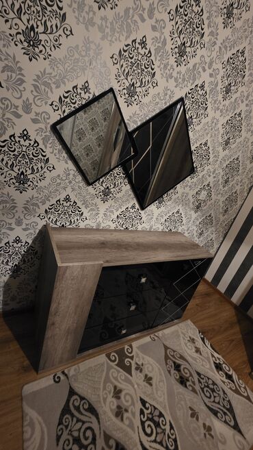 - Dekorativ güzgülər: divarda 2 kvadrat güzgü; şkaf qapısında əlavə romb formalı güzgü elementləri.