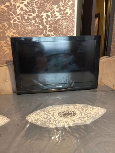 Samsung LCD televizor - Ekran diaqonalı təxminən 32" (80 sm civarı) - Geniş çərçivəli klassik dizayn, oval dayaq ayağı - Ön paneldə “Samsung” loqosu - Arxa hissədə ventilyasiya panjurları və divar...