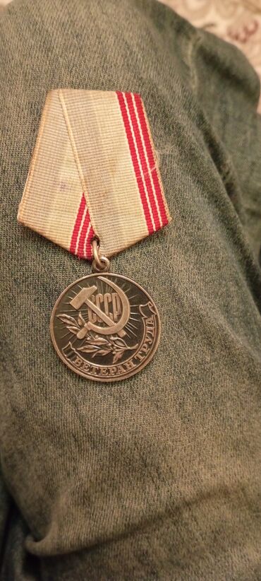 - Orijinal sovet dövrü medal. Ön üzdə oraq-çəkiç və “СССР” yazısı, aşağı hissədə “Ветеран труда” (Əmək veteranı) yazısı yer alır.