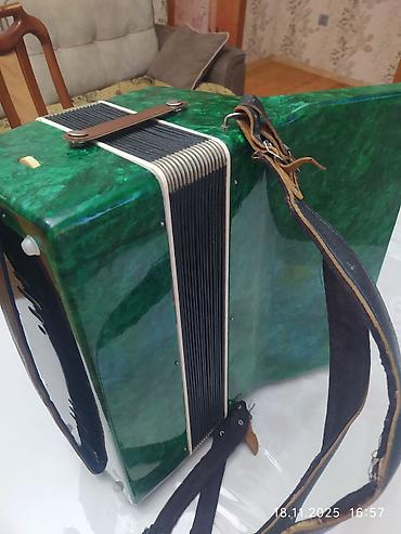 Köhnə tip “Krasnıy Oktabr” markalı akkordeon. - Korpus: yaşıl rəngli, dekorativ metal qabaq panel. - Klaviatura: pianino tipli sağ əl klaviaturası. - Sol əl: bas və akkord düymələri. - Körpü hissə...