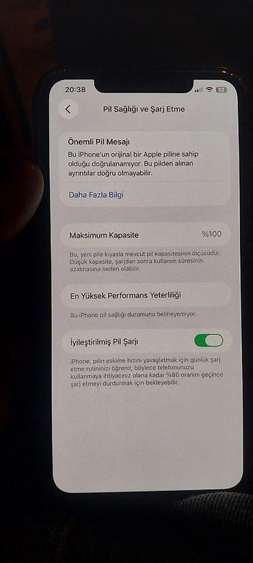 - Batareya: Maksimum tutum 100% göstərilir; “Önemli Pil Mesajı” bildirişi var (orijinal Apple batareyası təsdiqlənmir məlumatı çıxır); “İyileştirilmiş Pil Şarjı” açıq