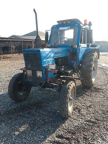 Mavi rəngli təkərli kənd təsərrüfatı traktoru.