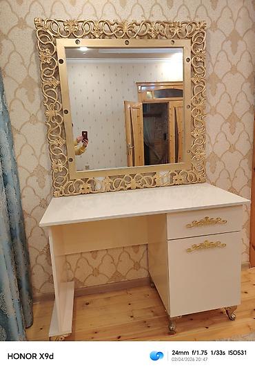 Vizaj/örtük masası və güzgü dəsti - Klassik üslubda güzgülü tualet masası - Geniş, kvadrat güzgü: üzərində rombvari dekorativ xətlər - Güzgünün sağ kənarında qızılı rəngli, naxışlı dekor panel - Q...