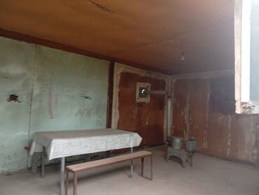 - Daxili plan: iri zal tipli bir otaq; içəridə stol, skamya və kiçik soba görünür