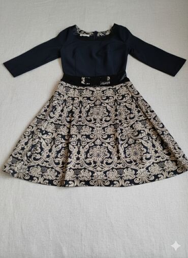 Rəsmi tədbirlər, ziyafət və xüsusi günlər üçün ideal klassik-feminin stil. Lacivərt üst və qızılı naxışlı ətək kontrastı sayəsində zərif və diqqətçəkən görünüş yaradır; qara topuqlar və minimalist aksesuarlarla mükəmməl uyğunlaşır.