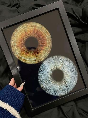 - Göz bəbəyi portreti: İki fərqli gözün makro təsviri yüksək keyfiyyətli çapla qara çərçivədə təqdim olunur; cütlüklər və dostlar üçün simvolik “göz izi” konsepti.