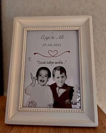- Fərdiləşdirilən foto çərçivələri: Adlar, tarix, qısa mesaj/sitat və dekorativ ürək motivi ilə tərtib olunur. Uşaqlıq fotoları və ya sevdiyiniz hər hansı şəkil qara-ağ və ya rəngli işlənə bilər.