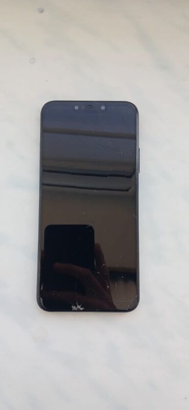 Ön tərəfində "çentik" dizaynına və arxa tərəfində ikili kameraya malik qara rəngli Huawei smartfonu. Cihazın arxa tərəfində "DUAL LENS" yazısı və barmaq izi skaneri görünür. Cihazın alt hissəsində ...