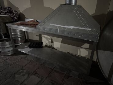 - Paslanmayan poladdan hazırlanmış peşəkar iş masası və üst hissəsində iri metal tüstü çəkən başlıq (ventilyasiya çıxışı üçün boru qoşulması hazır). Masanın alt rəfi var, qab-qacaq və ləvazimat saxlamağa uyğundur. Kafi, restoran, fast-food mətbəxi üçün əlverişli.