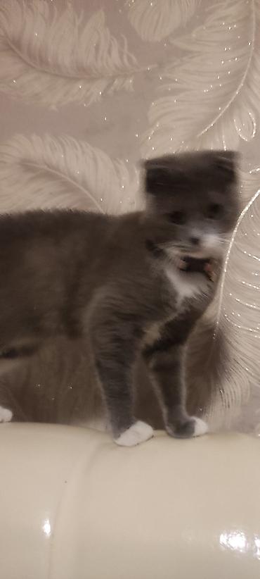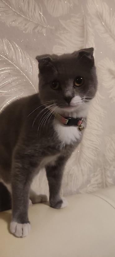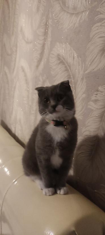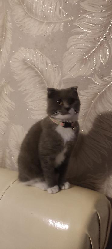 Skotish Fold tipli balaca pişik - Rəng: boz-ağ (sinə və pəncələrdə ağ ləkələr) - Qulaqlar: tipik qatlanmış - Gözlər: kənara iri ifadəli - Xasiyyət: mehriban, oyunsevər, insanla ünsiyyəti sevir - Ev...