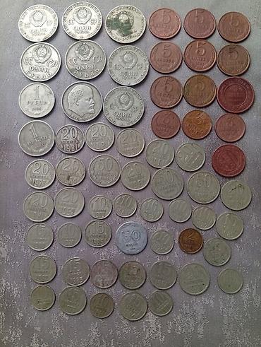 - Üzərində “СССР”, dövlət gerbi, nominal və buraxılış ili göstərilən standart dövriyyə sikkələri; bəzi yubiley dizaynları mövcuddur.