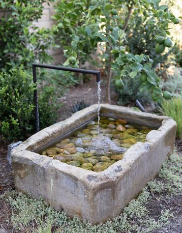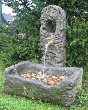 - Bağ və həyət üçün daş çanaqlı dekorativ su qurğuları/fəvvarələr – daş hövzə, üst hissədə kran və ya boru ilə axarlı kompozisiya; içərisi çınqıl daşlarla bəzədilmiş.
