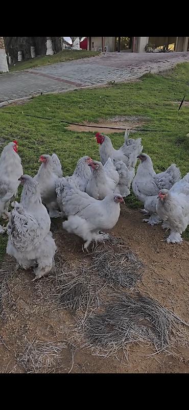 Təsvir: - Cins: Brahma (iri ölçülü, tüklü pəncəli ət‑yumurta istiqamətli dekorativ toyuqlar) - Rənglər: Ağ xoruz və toyuqlar, əlavə olaraq boz‑gümüş tonlarda dişi fərdlər - Xüsusiyyətlər: - Güclü...
