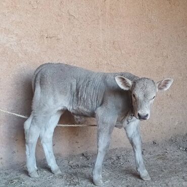 Ağ rəngli dana - Növ: mal-qara, dana - Rəng: açıq krem/ağ, baş və qulaq hissəsində ləkələr - Cinsiyyət: dişi kimi görünür (quyruq altı görünüşünə əsasən) - Qulaq və boyun hissəsində ipin bağlandığ...