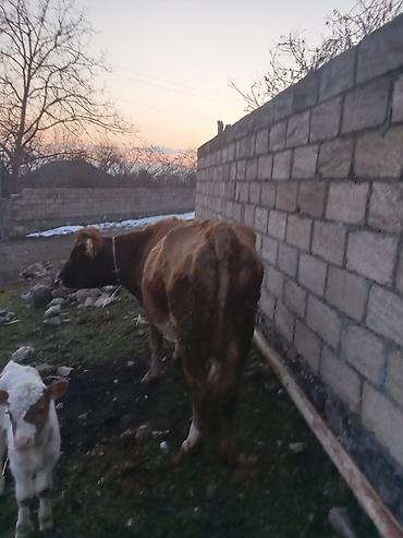 Inək və buzov dəsti - Qara rəngli inək, qulaqlığında birka var. - Yanında yeni doğulmuş sarı-ağ rəngli buzov (qulaqlığında birka). - Buzov ana altında əmirdilir. - Şəkillər yan 22, 2026 tarixində ...