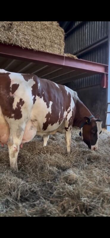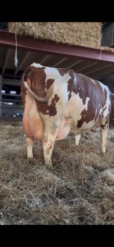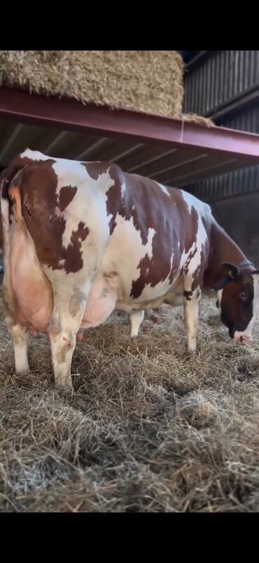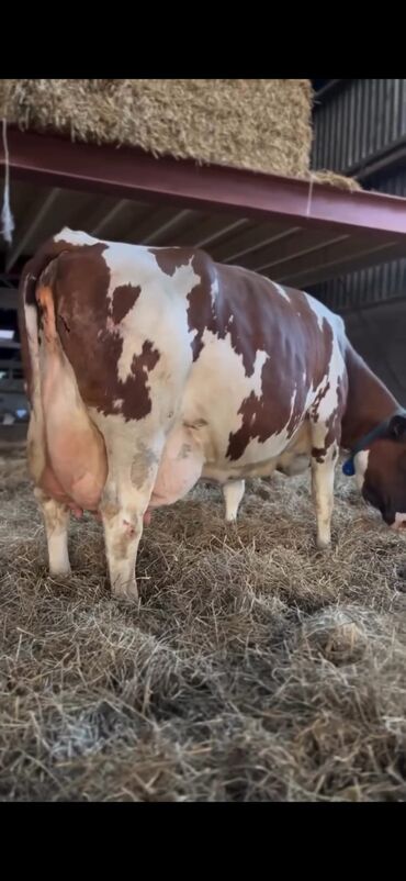 Süd istiqamətli inək – al-qəhvəyi və ağ ləkəli rəngdə, iri və simmetrik süd vəzisi ilə. Şəkillərdə tövlədə quru otla bəslənir, boynunda identifikasiya yaxalığı görünür. Geniş gövdəli, möhkəm döş xətti və dörd nizamlı məmə quruluşu var, sağım üçün rahatdır. Süd istehsalı üçün uyğun, sakit temperamentli heyvan təsviri verir. Südçülük təsərrüfatına, mexaniki və ya əl ilə sağım sistemlərinə inteqrasiya üçün əlverişli. Genetik olaraq süd məhsuldarlığına yönəlmiş tipik xarici göstəricilər: dərin gövdə, güclü arxa ayaq dayağı, iri süd cisimi. Qidalanma rasionu kimi quru ot və silosla saxlanmaya yararlıdır.