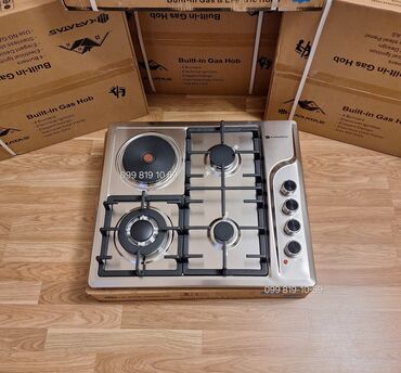 EZEL quraşdırılan qarışıq soba paneli - Yanacaq növü: 3 qaz ocağı + 1 elektrikli disklik (solda) - İdarəetmə: sağ zolaqda 4 ədəd fırlanan mexaniki düymə - Alov mənbələri: fərqli ölçülü üç qaz gözü...