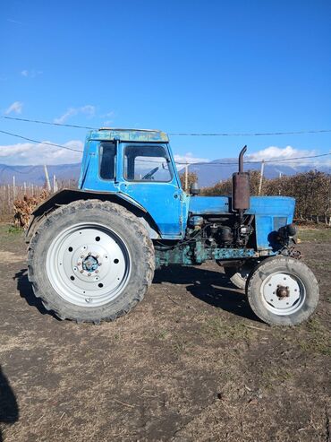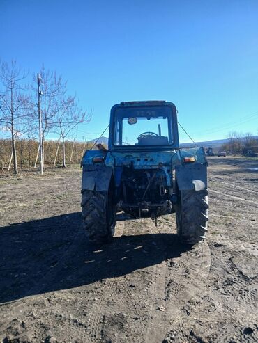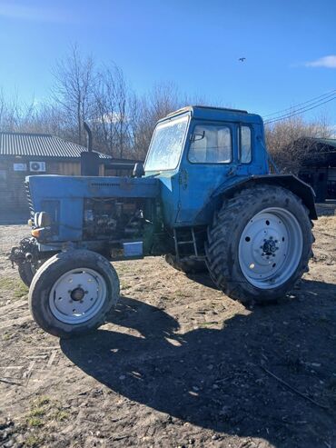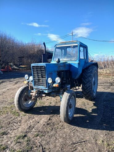 Mavi rəngli təkərli kənd təsərrüfatı traktoru.
