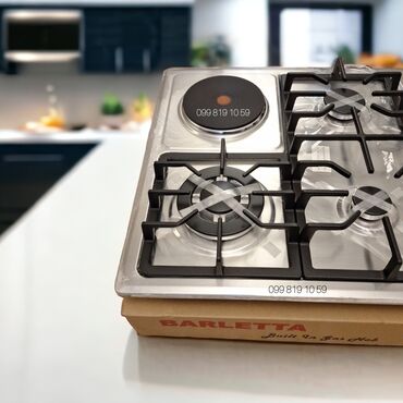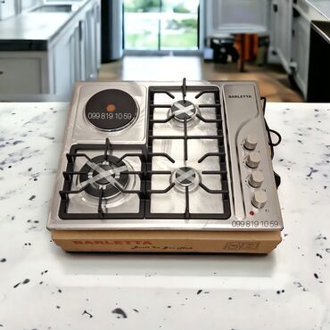 EZEL quraşdırılan qarışıq soba paneli - Yanacaq növü: 3 qaz ocağı + 1 elektrikli disklik (solda) - İdarəetmə: sağ zolaqda 4 ədəd fırlanan mexaniki düymə - Alov mənbələri: fərqli ölçülü üç qaz gözü...